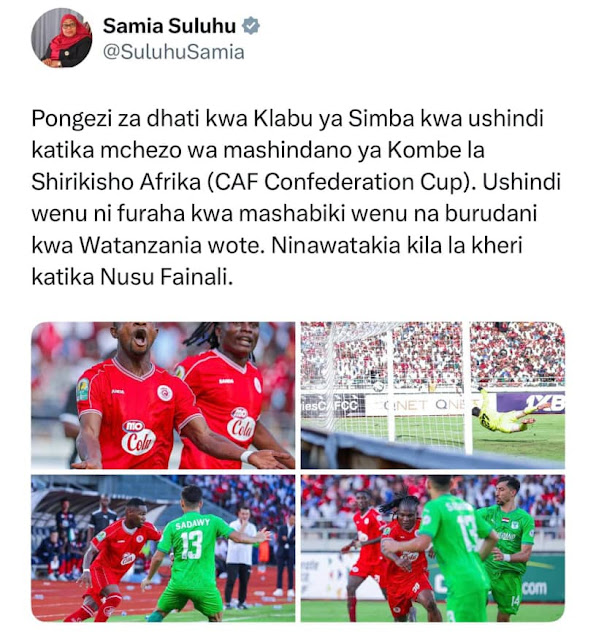 Rais wa Jamhuri ya Muungano wa Tanzania Mheshimiwa Dkt. Samia Suluhu Hassan ameipongeza klabu ya Simba SC kwa kutinga Nusu Fainali katika kombe la shirikisho Afrika (CAF Confederation Cup).